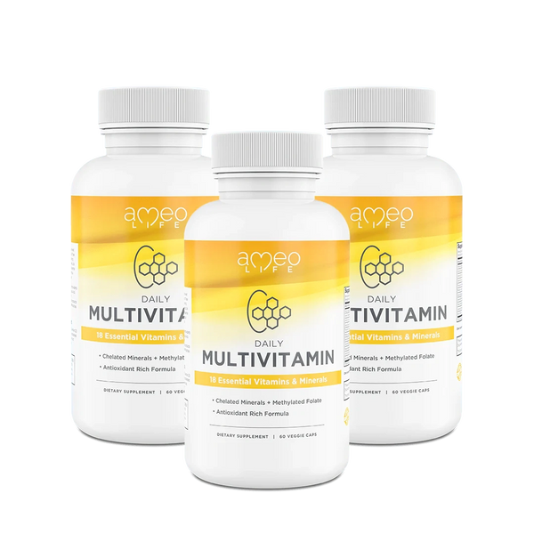Ameo Life delivers a powerful daily Chelated Multivitamin packed with 18 essential vitamins and minerals. The proprietary formula contains chelated minerals and methylated folate for added bioavailability, and is rich in the natural antioxidants Vitamin C, Vitamin E and Alpha Lipoic Acid.